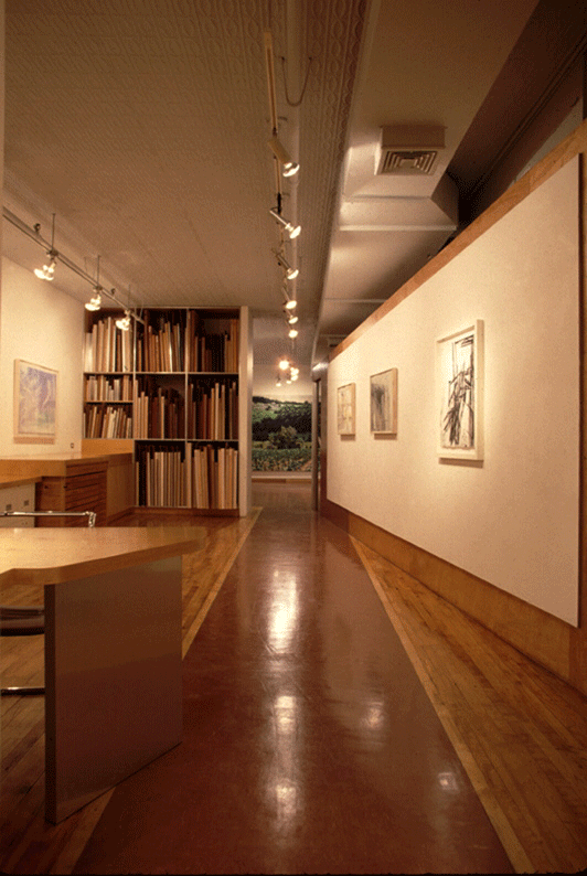 wire-glass. It is centered on a maple and aluminum reception desk which, in turn, sits on a maple "slab" with