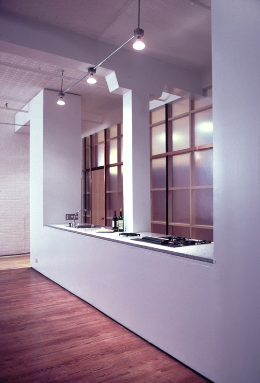 The “fore-stage” between the kitchen and translucent wall, and the “back-stage” lies behind the translucent wall (bedroom).